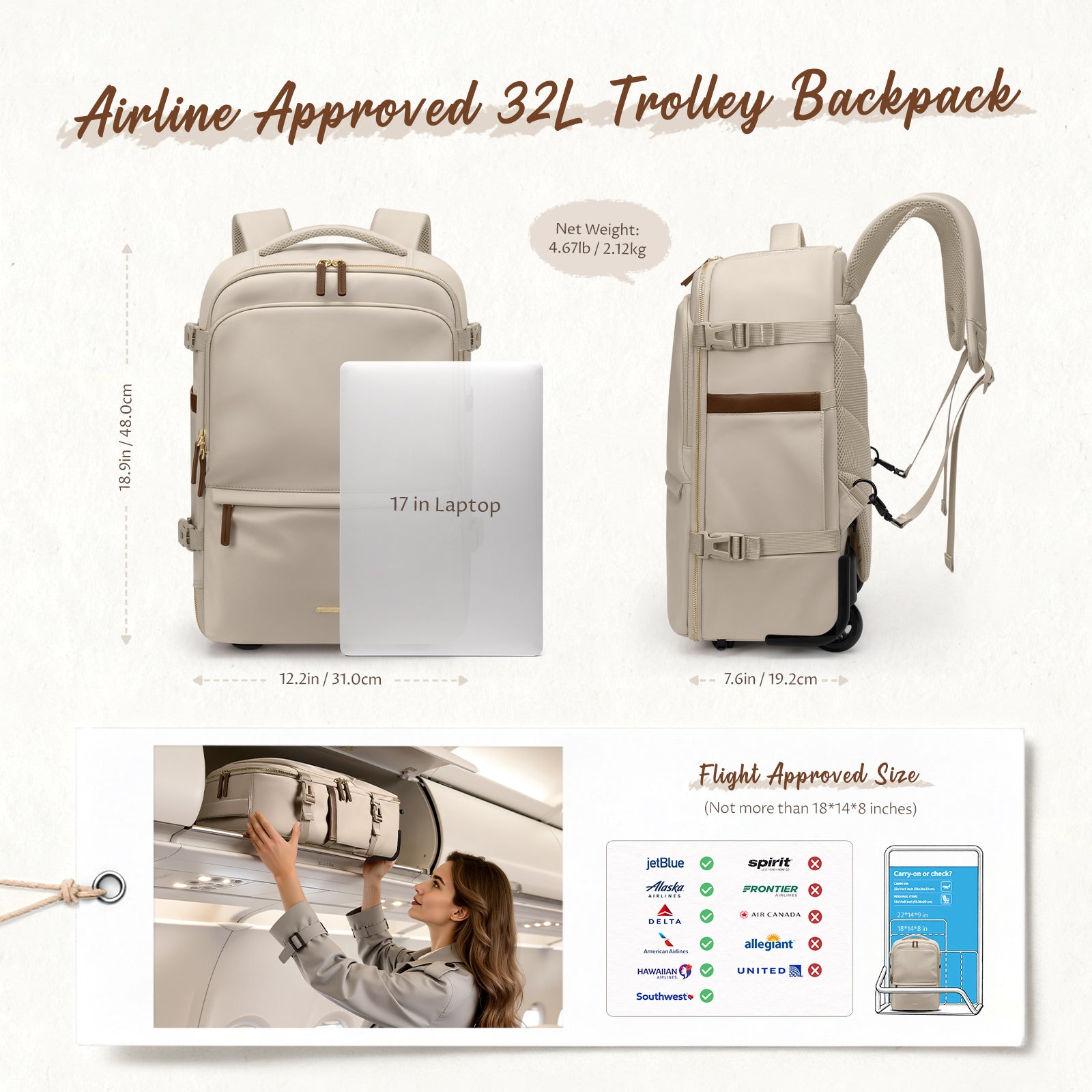 - 32L Capacity with Multi-Compartment Organization - This 32L carry-on rolling backpack features a padded 17-inch laptop sleeve, a spacious main compartment with clothing straps, and multiple zipper pockets for documents, chargers, and travel items. Front organizer panel includes slip pockets, pen slots, and a detachable key leash—ideal for efficient travel and workdays.
