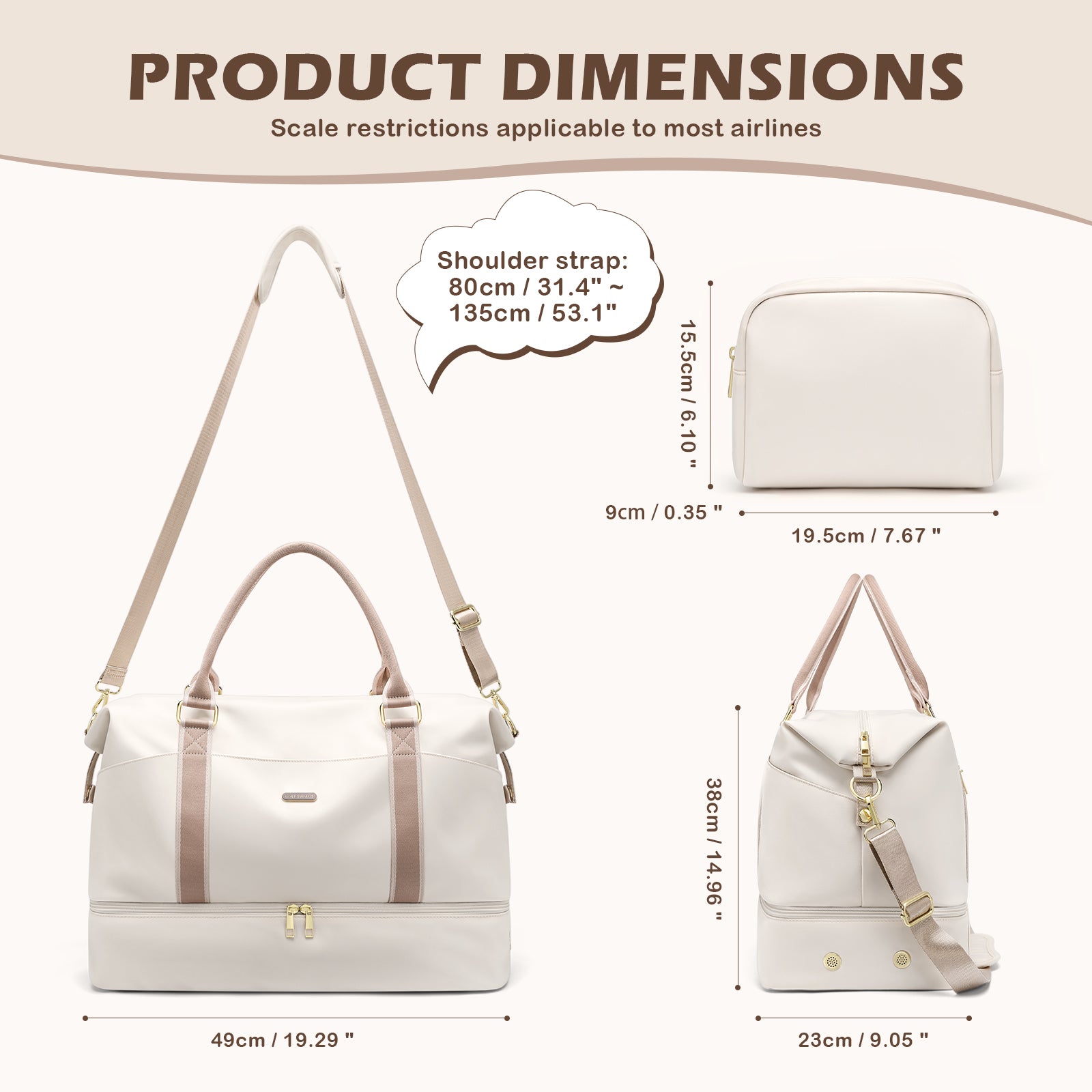 【2-Piece Travel Set & Large Capacity】 This 2-piece weekender bag set includes a main travel duffel (49×38×23 cm / 19.3×15×9 in) and a matching toiletry bag (19.5×15.5×9 cm / 7.7×6.1×3.5 in). 2.2lbs weight and 46L spacious capacity for 3–5 days of travel essentials, perfect for short trips or weekend getaways.