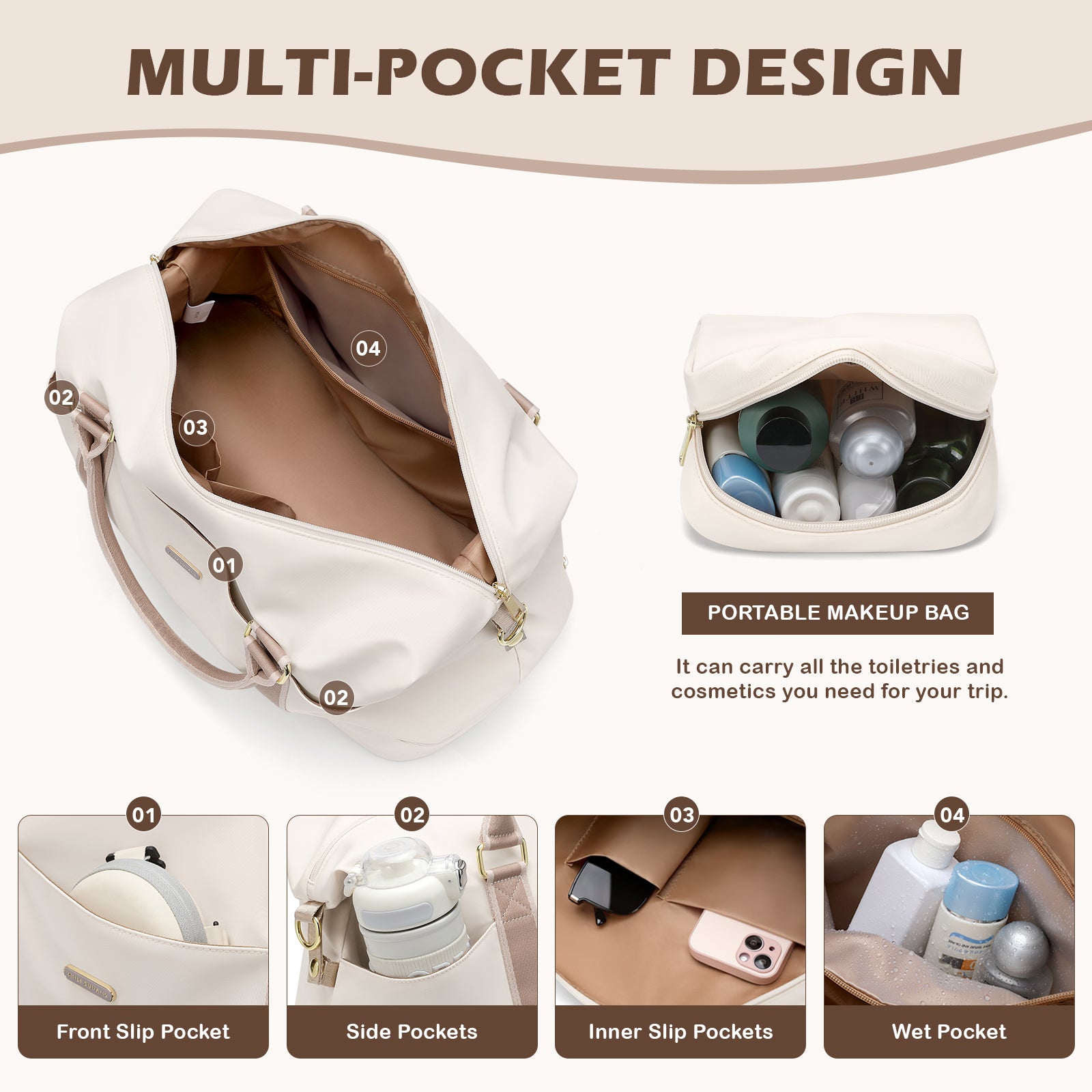 【Waterproof Pocket & Organized Interior】 The main compartment includes a waterproof zipper pocket for wet clothes or toiletries, plus two insert pockets for small items. Keep your belongings organized and dry wherever you go.