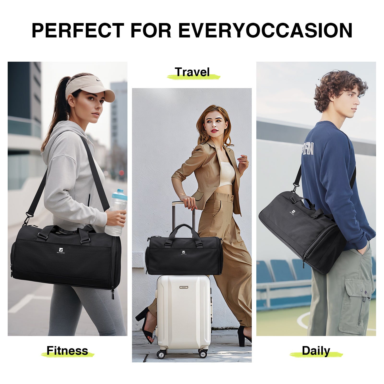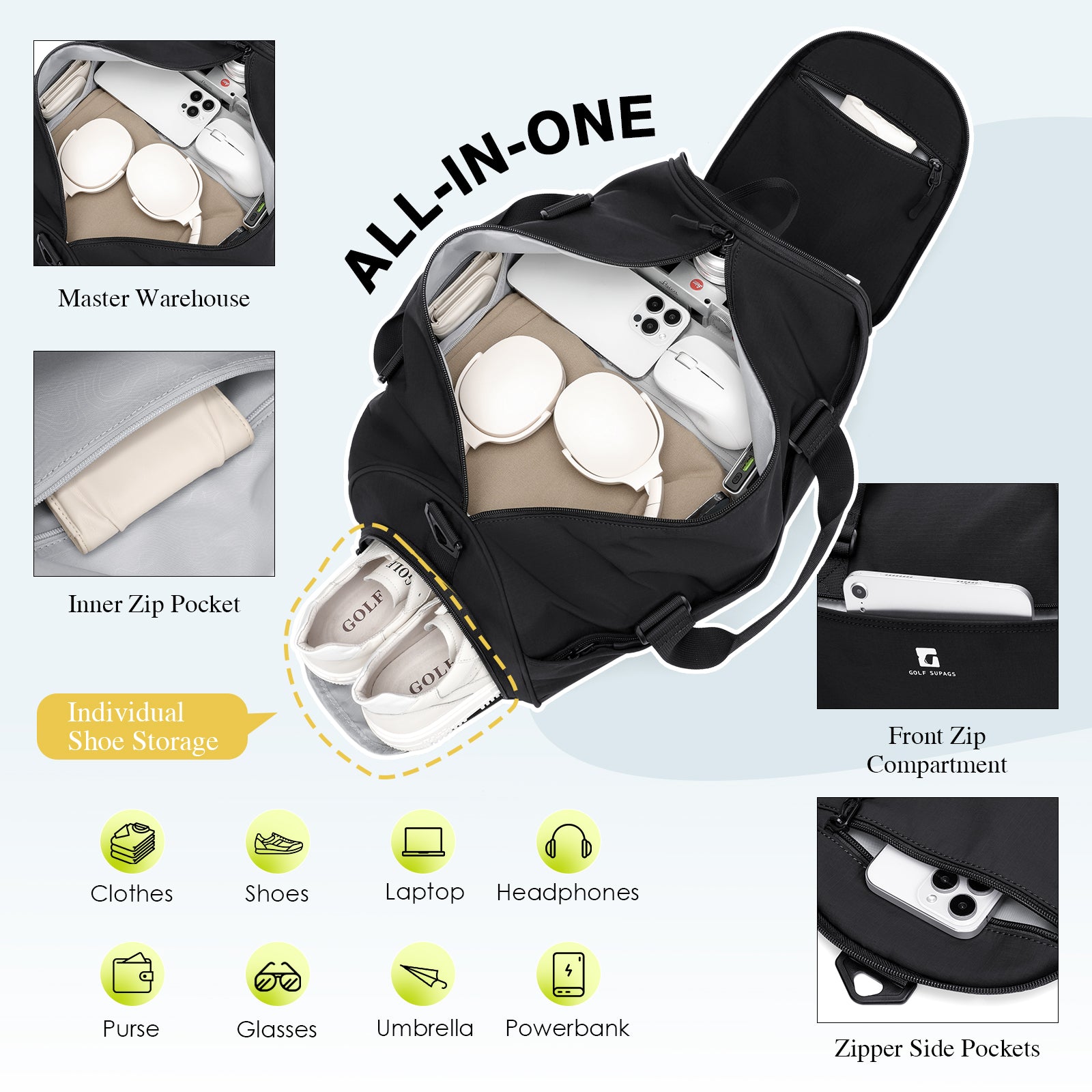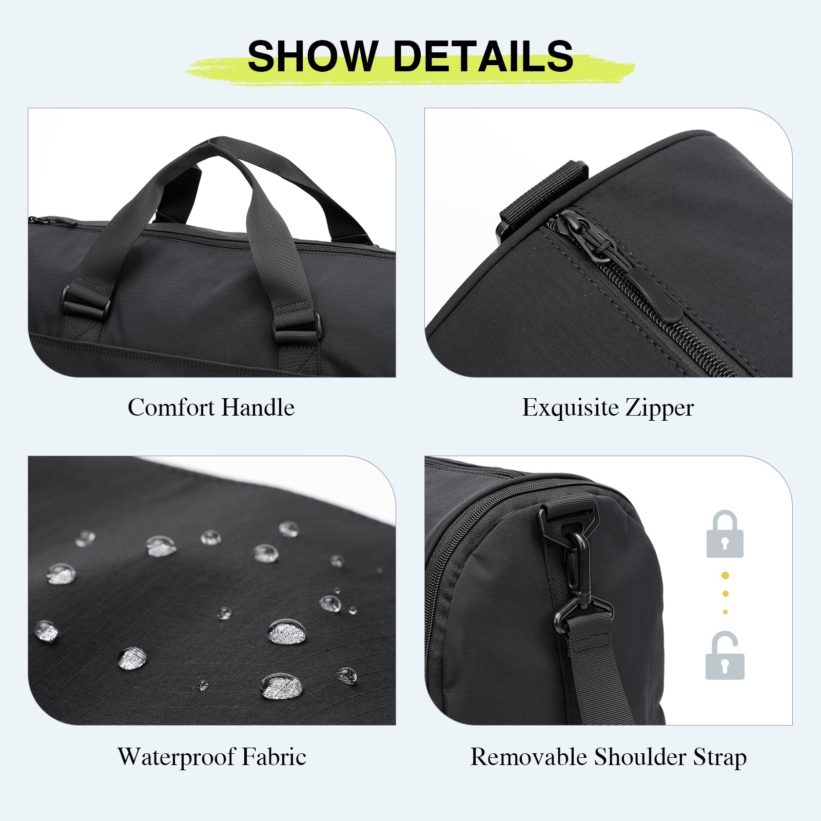 - Independent Shoes Compartment: This travel bag has a separate shoes compartment to offer a dedicated place of storage for your shoes, you can easily separate your shoes from other objects without making other objects dirty. The shoe compartment is suitable for most sizes of shoes;