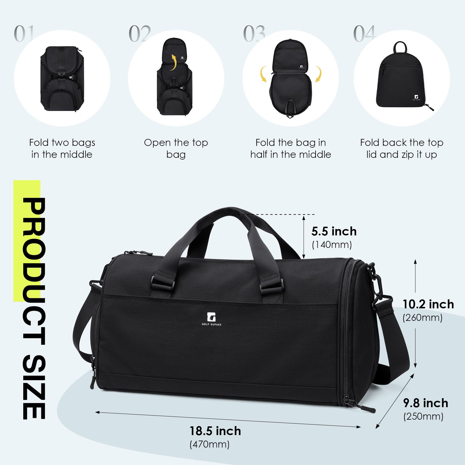 - Foldaway Design: This travel duffel bag can be folded and stowed away in the side zip pocket. This innovative design ensures that the travel bag does not take any additional space in the event of non -use, so that it is easy to stow and carry. Whether in everyday life or when traveling, this travel bag perfectly meets all requirements. Folded Size: 9.84''*9.05''*3.54''/25*23*9cm;