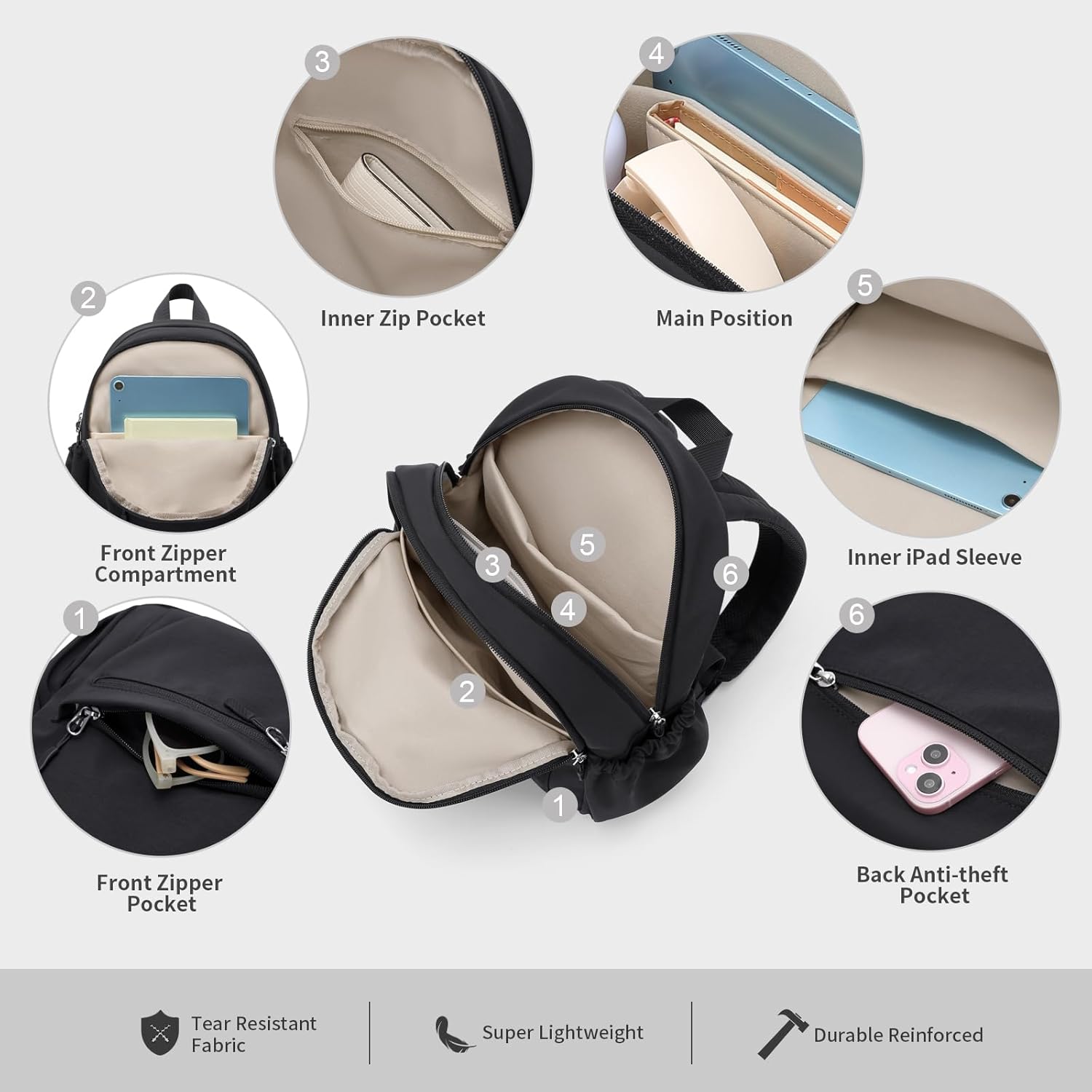 - Compact Yet Spacious Design - Despite its mini size, this backpack offers ample storage with a well-organized interior. It features a main compartment with an iPad sleeve (fits up to a 9.7-inch iPad), an inner zippered pocket, and a secondary compartment with an inner slip pocket, allowing you to carry all your essentials effortlessly.