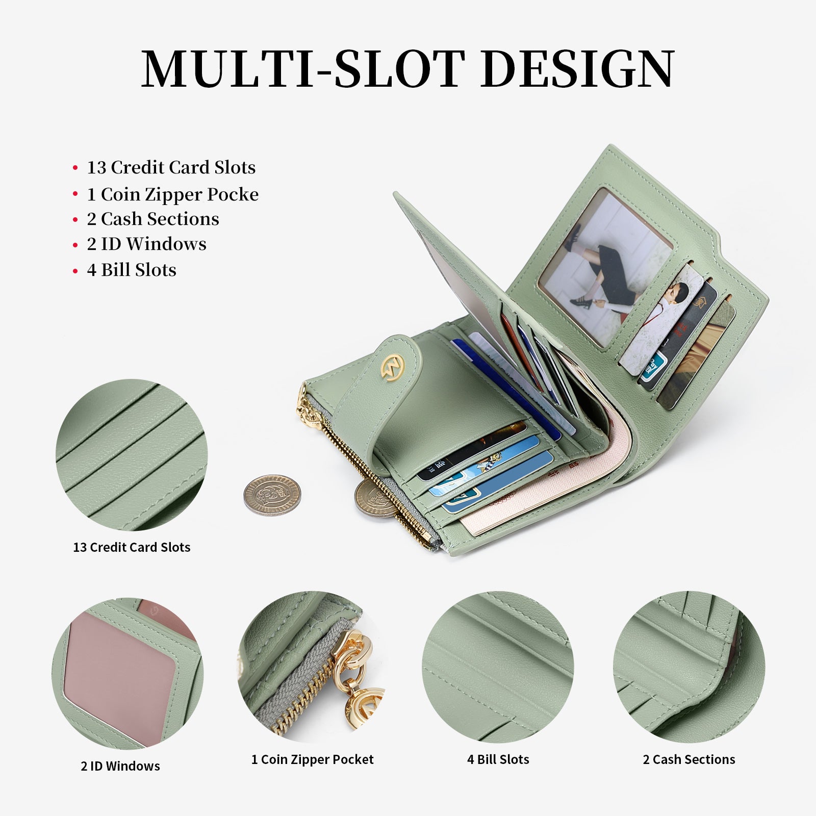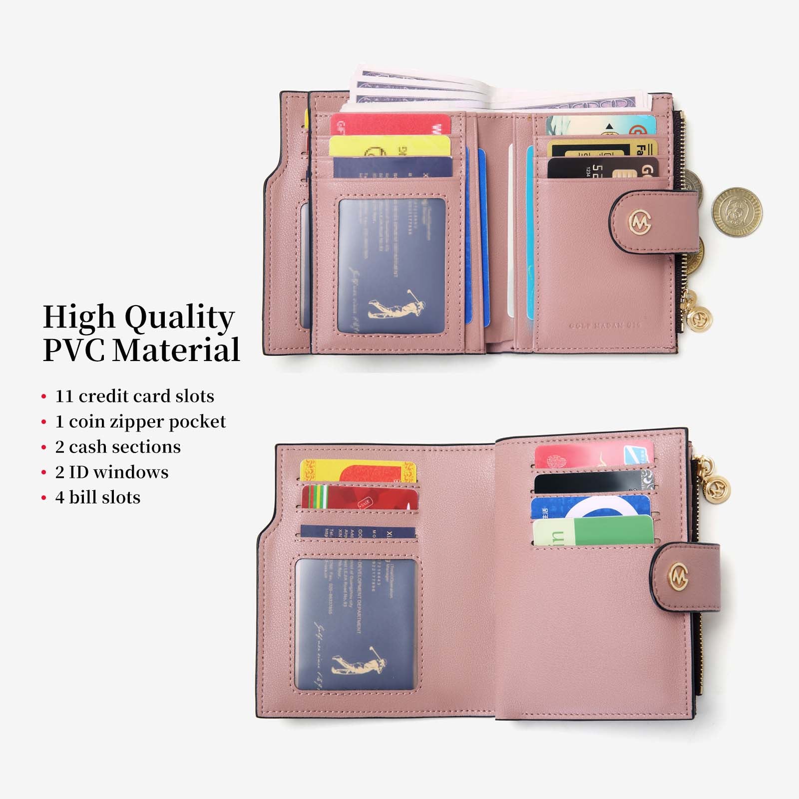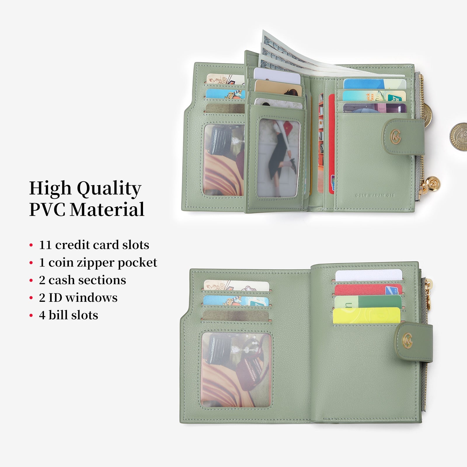 - đăCompact & Spaciousă- The wallets for women built with 11 credit card slots, 2 ID windows, 2 cash sections, 4 bill slots, and 1 coin zipper pocket. Roomy enough for fitting plenty of cards, change and dollar bills, coins, keep them well organized.